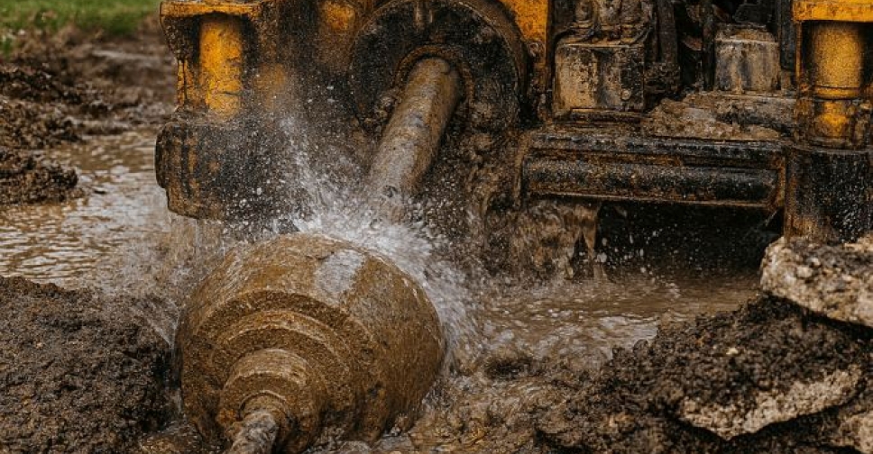 - Расширение скважины: увеличение диаметра скважины до требуемых размеров для установки канализационных труб.